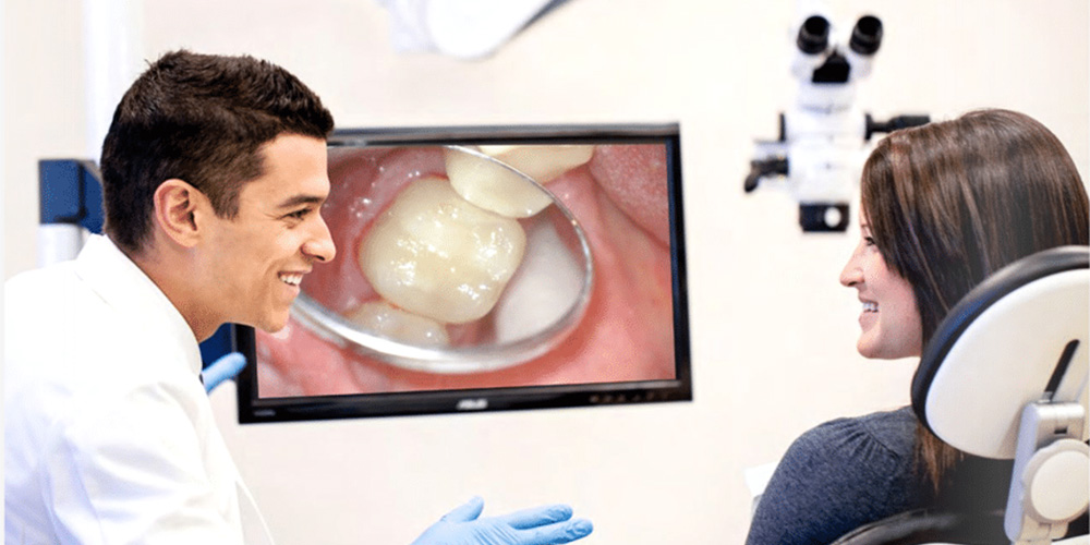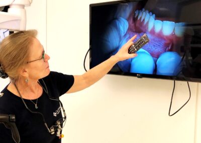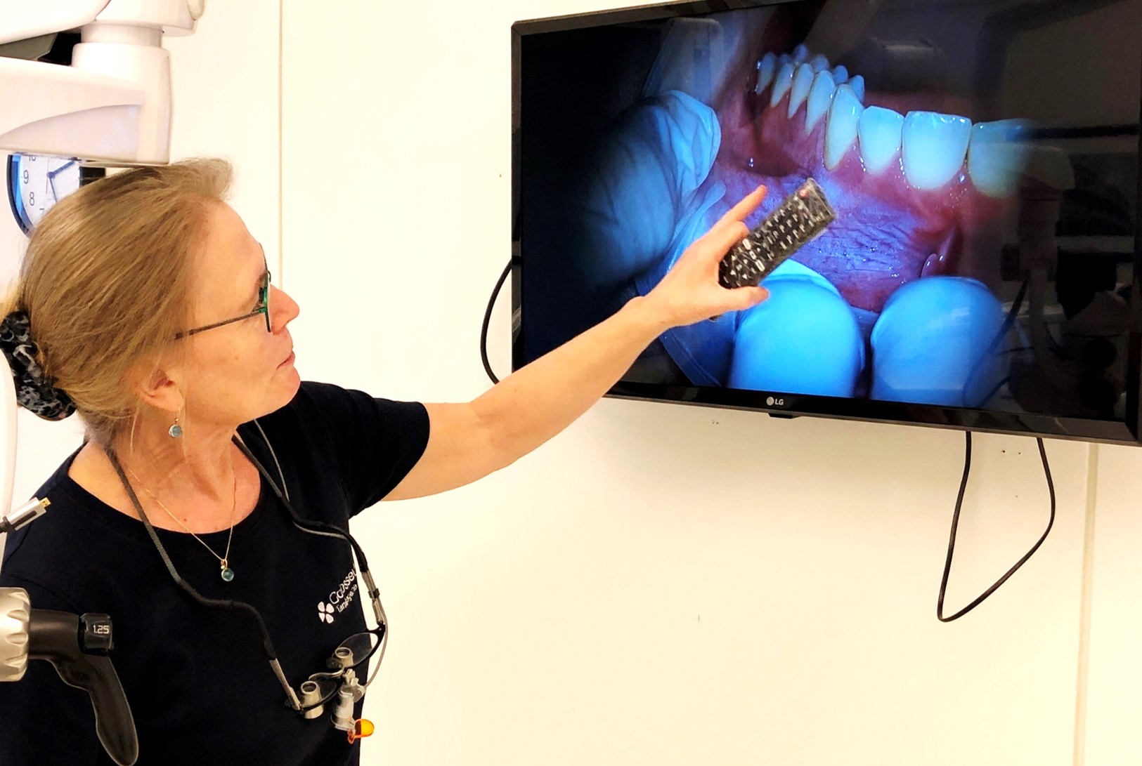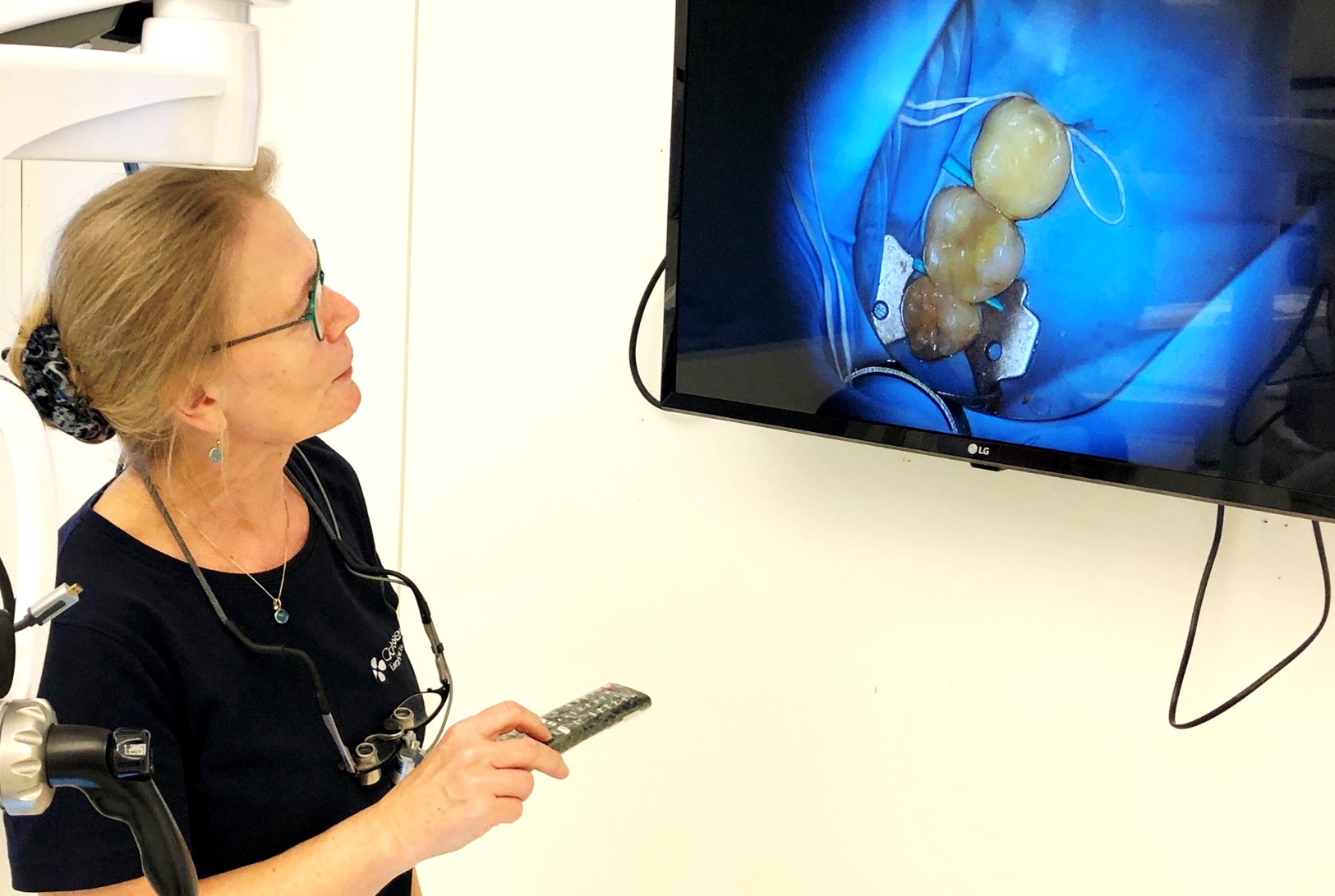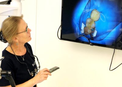 Når patienter har siddet i stolen hos Kirsten, kan de efterfølgende få et visuelt indblik i behandlingen. For med mikroskopet har hun mulighed for at filme og tage fotos under processen og vise det på den fjernsynsskærm, hun har hængt op på væggen.